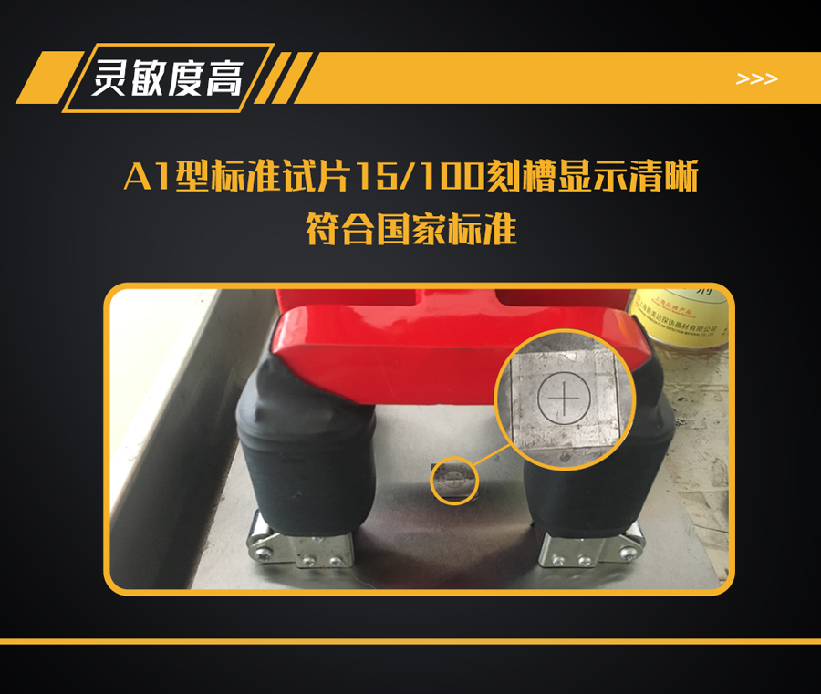 2、靈敏度高,可清晰完整地顯示A1型(15/100)標(biāo)準(zhǔn)試片上的刻槽,符合國(guó)家標(biāo)準(zhǔn);