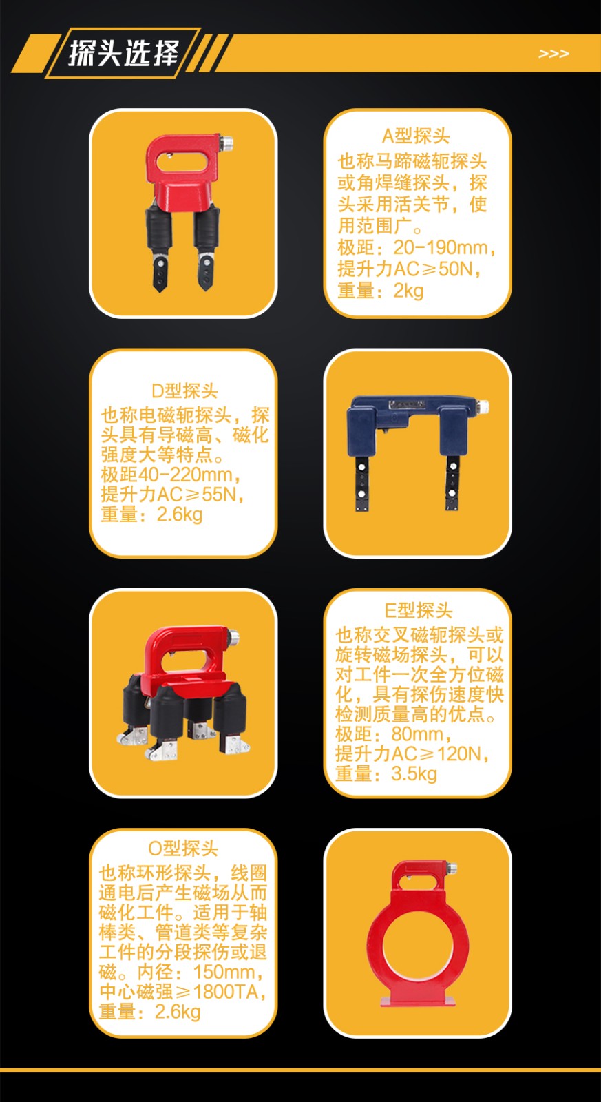 (1)A型探頭:也稱馬蹄磁軛探頭或角焊縫探頭,探頭采用活關(guān)節(jié),使用范圍廣。極距:20mm—190mm,提升力AC≥50N,重量:2kg;